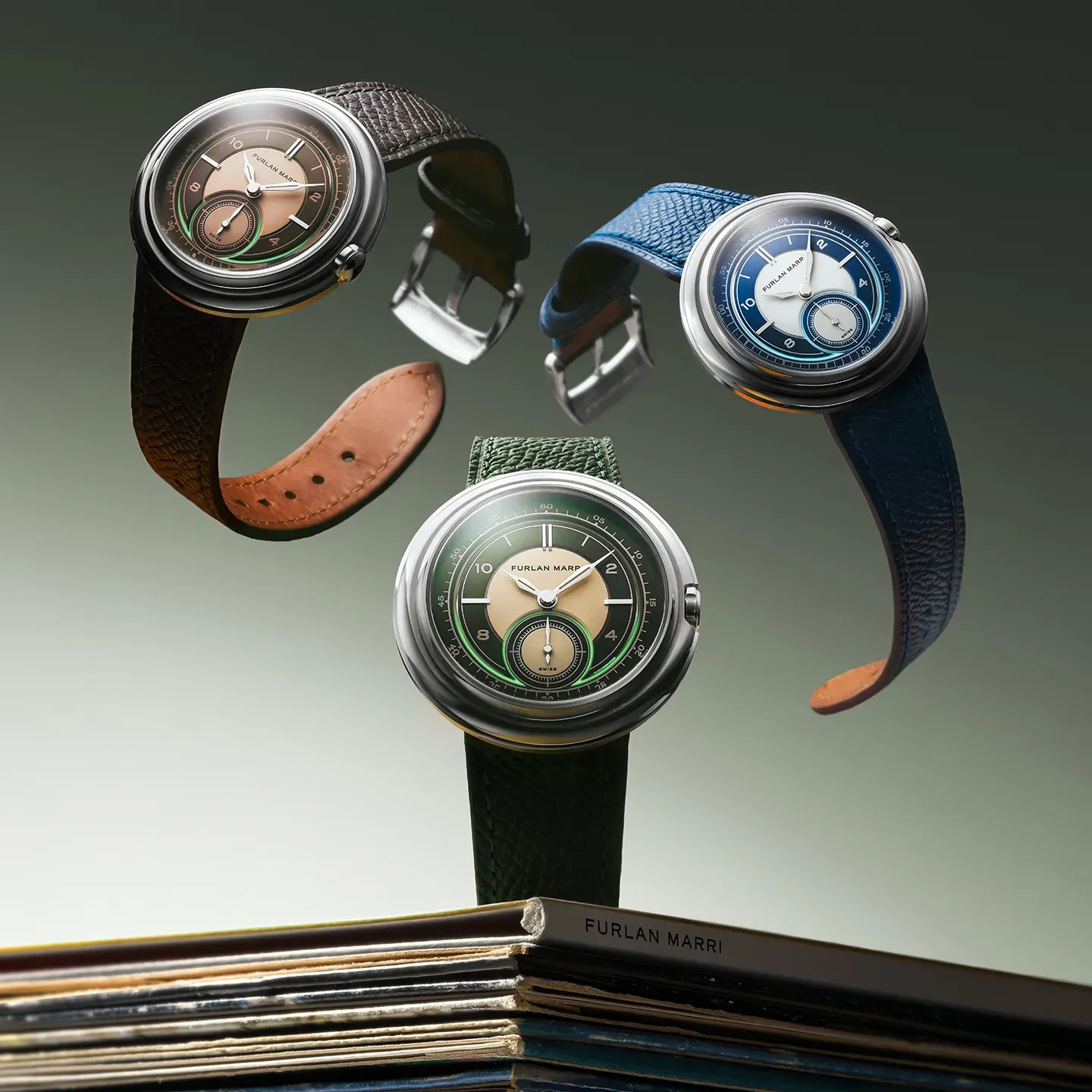 تصاميم فورلان مري مستوحاة من ساعات الأربعينات والخمسينات، لكنها تحمل لمسة عصرية دقيقة. إعادة استخدام عناصر كلاسيكية، مثل المكابس الدائرية Tasti Tondi وشكل العلبة الأنيق، تكريم للساعات السويسرية التاريخية، بينما التفاصيل الدقيقة في القرص تمنح كل ساعة شعورًا بالتميز عند النظر عن قرب. سيارات رياضية قديمة، سجاد فارسي، وحتى الإحساس بالتصميم الصناعي العصري، كلها عناصر أُدمجت لتخلق ساعات تحمل هوية قوية.